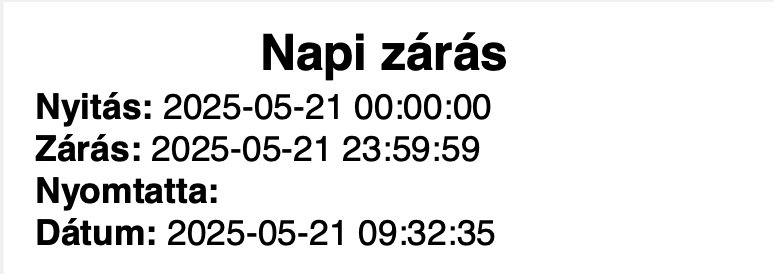 A napi záráskor nyomtatott blokk mostantól tartalmazza a nyomtatás pontos dátumát és időpontját is. Ez segíti az elszámolást, az adminisztrációt, valamint az esetleges későbbi visszakeresést és ellenőrzést is megkönnyíti.