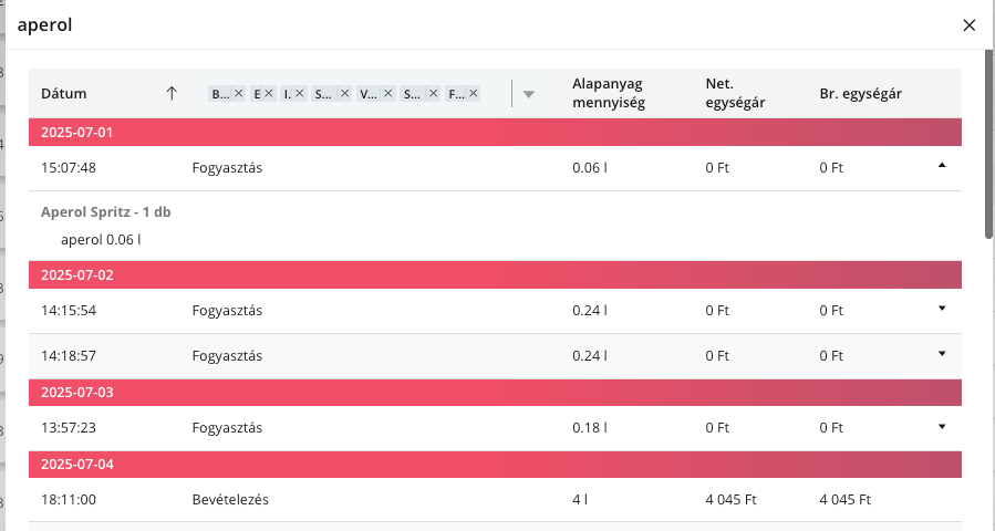 Ez azt jelenti, hogy minden egyes alapanyagnál – például Liszt – másodpercre pontos bontásban megtekinthető, milyen változások történtek egy adott időszakban.